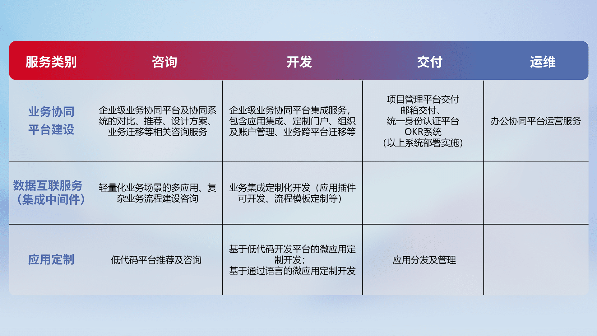 针对钉钉、、企微、、、IDaas等平台级产品提供产品的规划、、、方案、、交付、、、、定制化开发等服务,,,,实现如统一协同办公、、智能客户服务、、混合会议管理、、智能数据查询、、、、等业务场景,,,实现数字化转型。。。。