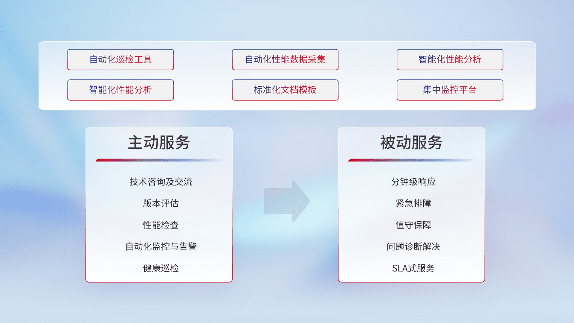 智能化工具和标准化文档,,保障服务质量,,,,提供主动服务(包含技术咨询、、、、版本评估、、、性能检查、、自动化监控与告警、、、健康巡检)和被动服务包含(分钟级响应、、、、紧急排障、、值守保障、、问题诊断解决、、、SLA服务)。。